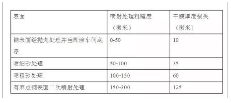 工件表麵粗糙度造成的油漆損耗在經過噴射處理的表麵塗漆時, 鋼板波峰處的膜厚要小於波穀處的膜厚,為滿足波峰處的防腐厚度要求(避免點蝕),波穀的坑窪中所“藏”的油漆就相當於被損耗了,此即“鋼板粗糙度消耗損失 ”。下表給出不同的噴射方式引起漆料損失(以幹膜厚度表示):